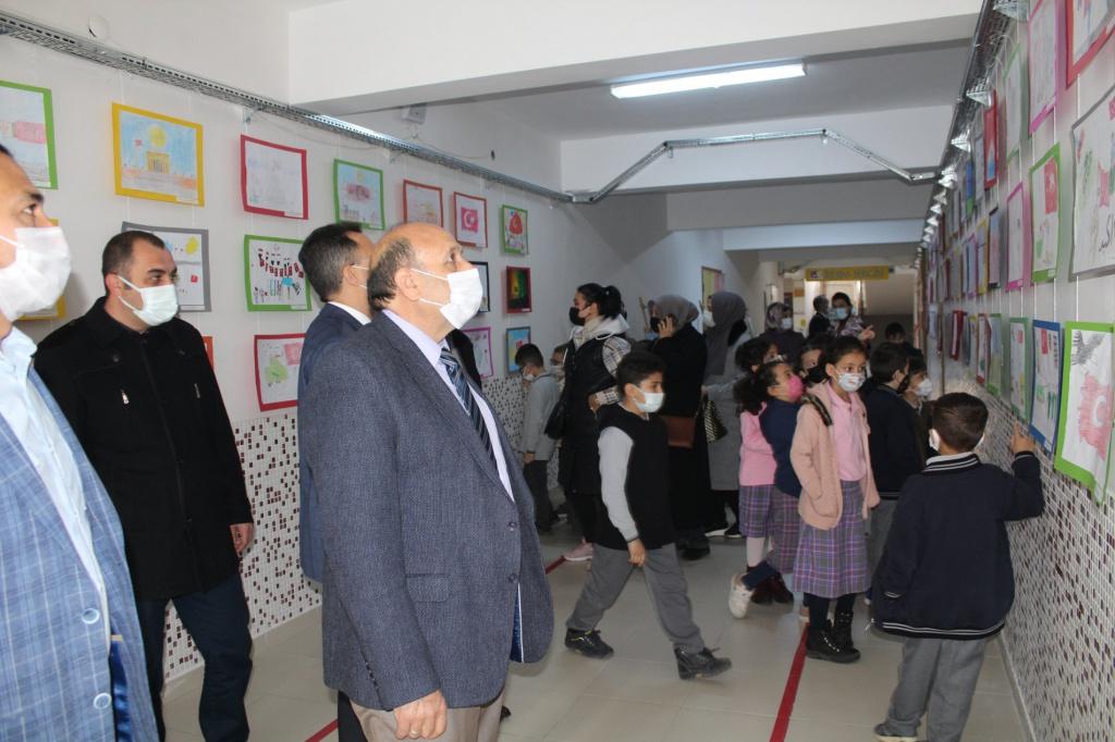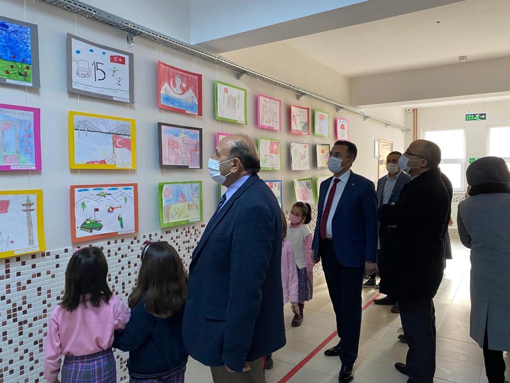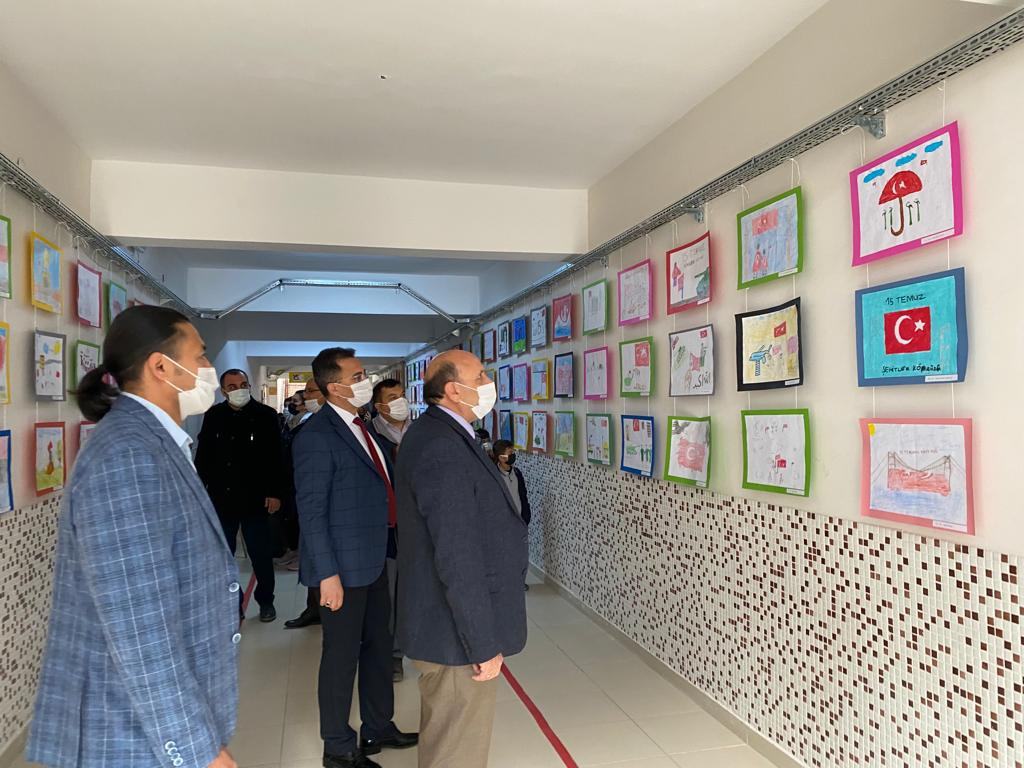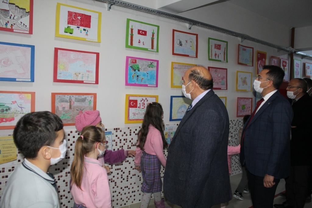23 Kasım 2021 Salı günü okulumuzda öğrencilerimizin demokrasi, millî birlik ve beraberlik, vatan sevgisi, yurt savunması ile şehitlik konularında yaptığı resimlerden oluşan resim sergisi yapıldı. Sergimiz İlçe Milli Eğitim Müdürü Derviş ÖZÇAL, Milli Eğitim Şube Müdürü Mehmet Ali KELEŞ, okul müdürleri, öğretmenlerimiz, velilerimiz ve öğrencilerimizin katılımıyla gerçekleştirildi. Resim Sergisini gezerek incelemelerde bulunan İlçe Milli Eğitim Müdürümüz Sayın Derviş ÖZÇAL, serginin açılmasında emeği geçen okul idarecilerine, öğretmenlere ve öğrencilere teşekkür etti.