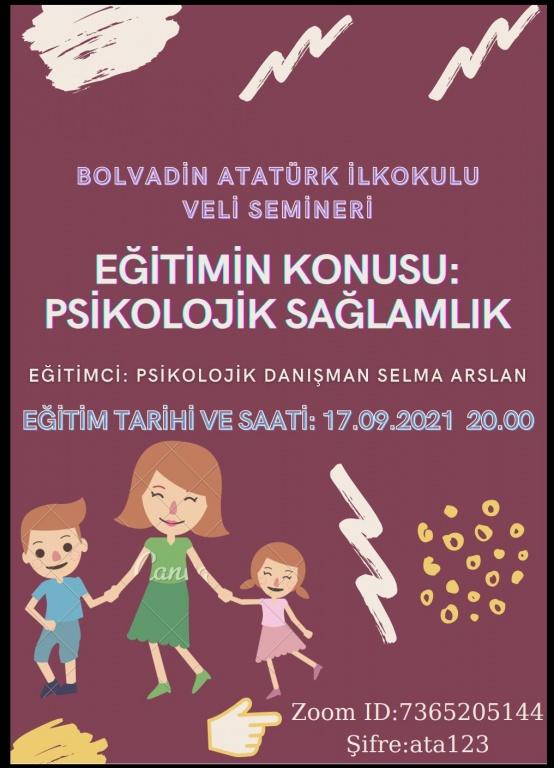 17 Eylül 2021 Cuma günü 20.00'da velilerimize yönelik Rehber öğretmenimiz Selma ARSLAN tarafından Psikolojik Sağlamlık konusunda zoom üzerinden seminer düzenlendi.